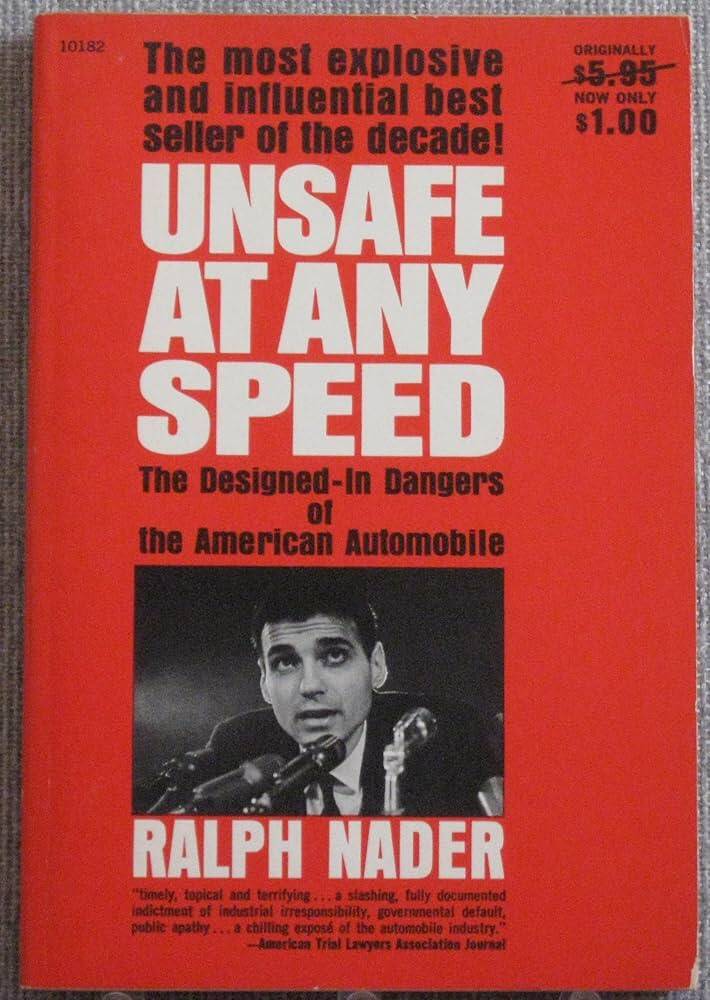 Nader analyseerde dat auto’s onveilig waren en publiceerde American Cars (1958) en wat later Unsafe at any speed (1965) dat met de eerste zin meteen met de deur in huis viel: ‘Al meer dan een halve eeuw lang heeft de automobiel dood en verderf gezaaid, verwondingen toegebracht en miljoenen mensen in het verdriet gestort.’